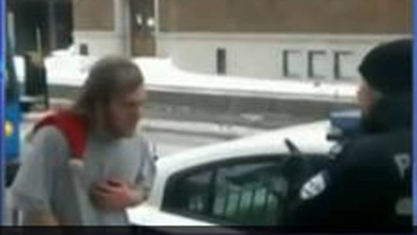 The homeless man, clutching a cup in his hand, is standing outside a Montreal Métro station dressed only in a T-shift, cut-off jeans and sneakers, with a Santa cap draped over his shoulder. The officer tells the homeless man he had been the object of four complaints over aggressive behaviour while asking for change.