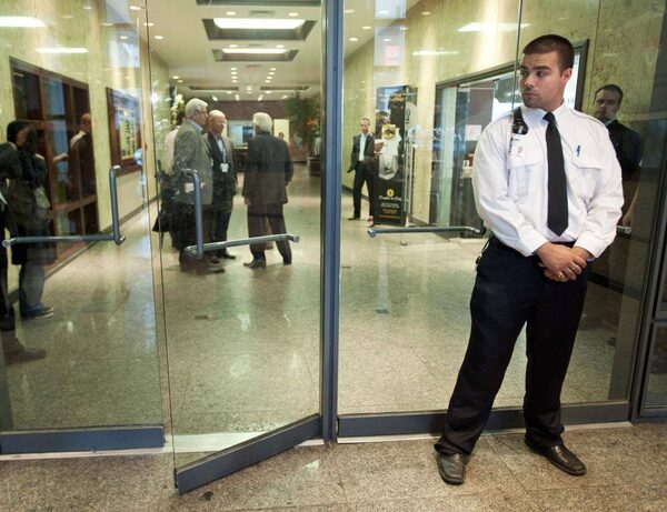 A security guard stands watch at the McGill University Health Centre offices (MUHC) in Montreal, Tuesday, September 18, 2012, where members of Quebec's anti-corruption squad conducted a raid at the premises.Graham Hughes/The Canadian Press