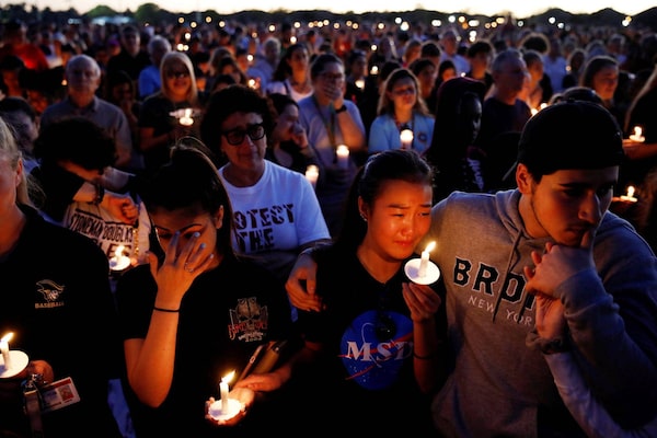 People attend a candlelight vigil for victims of Wednesday's shooting at nearby Marjory Stoneman Douglas High School, in Parkland, Fla., on Feb. 15, 2018.CARLOS GARCIA RAWLINS