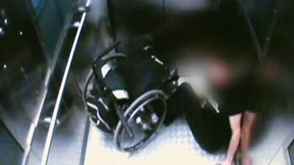 The video shows the victim lying on the cramped floor of an elevator, trying in vain to fend off blows and get back into his chair.