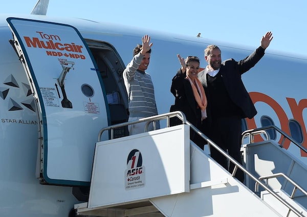 NDP Leader Tom Mulcair, wife Catherine Pinhas and son Greg Mulcair wave as they depart Regina, Sask., on Friday.Sean Kilpatrick/The Canadian Press