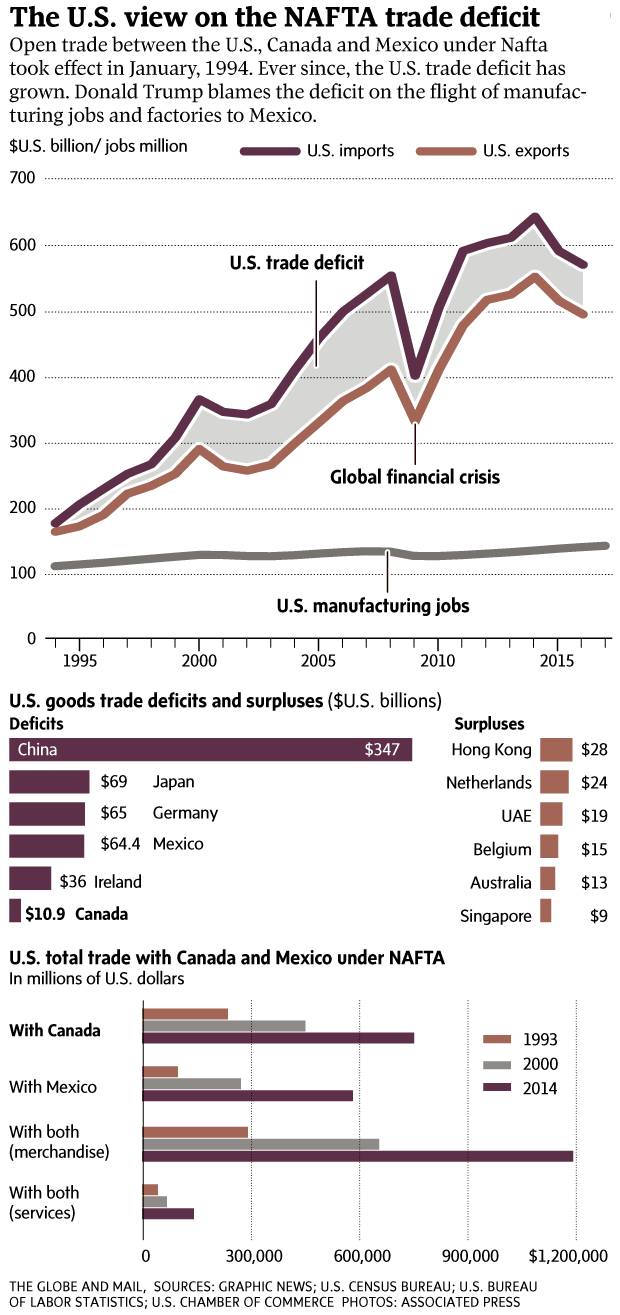 The top goal on Mr. Lighthizer's list is to "reduce the trade deficit with the NAFTA countries." Mr. Trump believes the U.S. trade deficit – which reached a total of $502-billion last year, including $55.6-billion with Mexico – is a result of jobs moving out of the country. The Trump administration has in the past floated the idea of somehow choking off Mexican imports or discouraging U.S. companies from setting up shop there. Whether the United States will also go after Canada is an open question: It actually posted a modest trade surplus – when both goods and services are considered – with Canada last year. Mexico and Canada can be expected to resist attempts to restrict the current market between the three countries. Mexico's list of negotiating priorities, submitted earlier this month by Economy Secretary Ildefonso Guajardo to the Mexican Senate, lists as its top objective to "maintain preferential access for Mexican goods and services" in the United States and Canada and eliminate "barriers to trade."