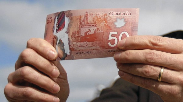 Bank of Canada Governor Mark Carney holds the new Canadian $50-bill, made of polymer, in front of the CCGS Amundsen, the Arctic research vessel depicted on the back of the new bill, in Quebec City, March 26, 2012.Mathieu Belanger/Reuters