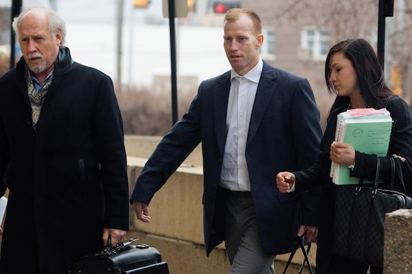 Travis Vader, centre, arrives at court with lawyer Brian Beresh, left, in Edmonton on March 8, 2016.AMBER BRACKEN/The Canadian Press
