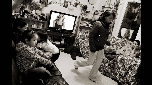 Parnee Ningeosiak sits on the couch while her grandchild Sheila Ningeosiak(left) watches her cousin Leetia Ningeosiak do her math homework.Peter Power/The Globe and Mail