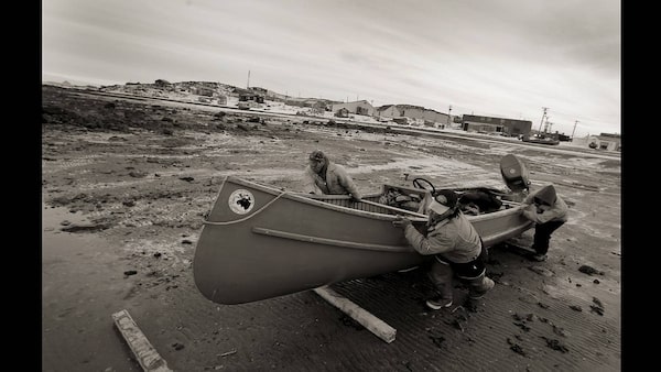 Men push a boat into the water in Cape Dorset, Nunavut on November 10, 2010. They were heading out to hunt seals.Peter Power/The Globe and Mail