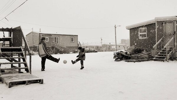 Two children play with a soccer ball in the snow in Iqaluit, Nunavut on November 12, 2010.Peter Power/The Globe and Mail