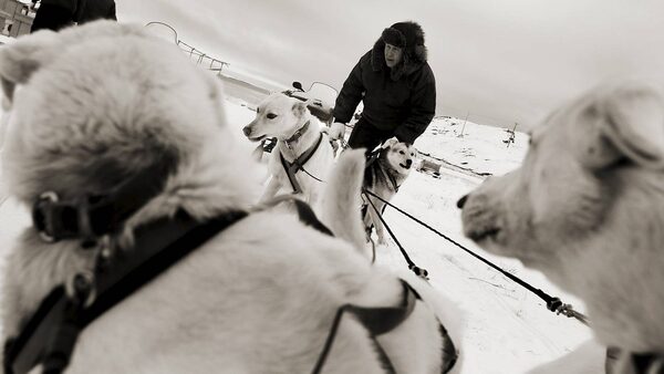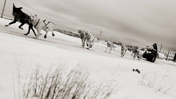 Mayor John Hickes runs a team of his dogs behind his snowmobile through Rankin Inlet, Nunavut on November 13, 2010.Peter Power/The Globe and Mail