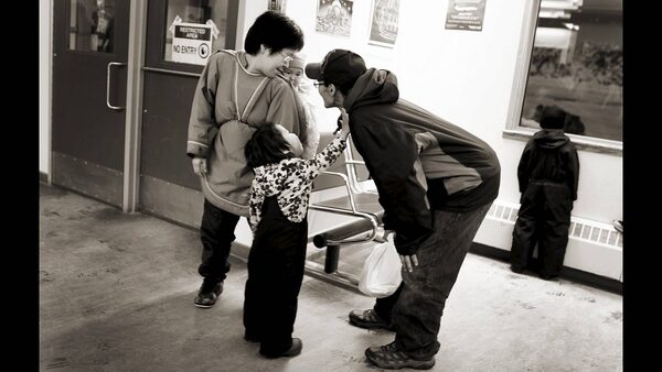 A man who had just stepped off a flight from Iqaluit greets his family inside the small airport in Cape Dorset, Nunavut on November 11, 2010.Peter Power/The Globe and Mail