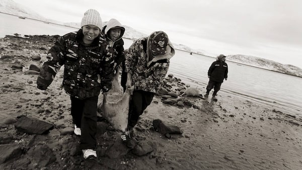The boys are happy to help carry the seals ashore after receiving instruction from an elder in Cape Dorset, Nunavut on November 10, 2010. Fifty per cent of Nunavut's children do not graduate from high school and with high unemployment many families still rely on the hunts for much of their food.Peter Power/The Globe and Mail