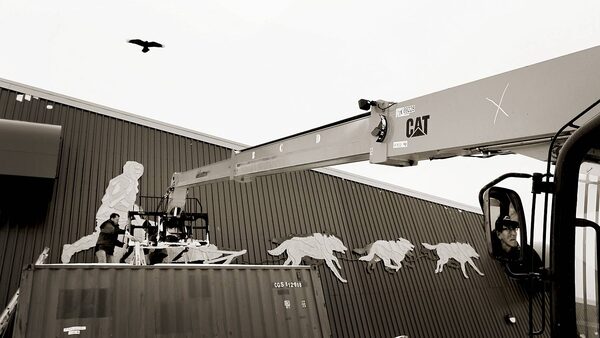 Workers remove signage on the side of Peter Pitseolak school in Cape Dorset on November 11, 2010. The cost for the signage was about $250,000 originally, but because a "southern" artist made a Yukon version of a sled and dog team, they are currently paying $60,000 more to have the sled replaced with a Nunavut version of a komatek.Peter Power/The Globe and Mail