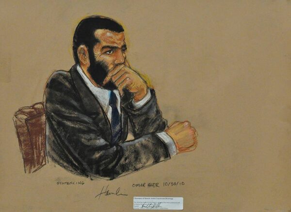 In this Pentagon-approved photograph of a sketch by artist Janet Hamlin, Omar Khadr, listens to closing arguments Oct. 30, 2010.
