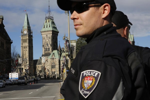 Ottawa police officers, with Parliament Hill in the background, guard the area around the National War Memorial in downtown Ottawa in this October 23, 2014 file photo.BLAIR GABLE/Reuters