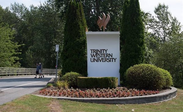Two men walk past the entrance to Trinity Western University, in Langley, B.C., on August 24, 2015. The Law Society of British Columbia is appealing a court ruling in favour of a Christian university that would ban sex outside of heterosexual marriage at its proposed law school. THE CANADIAN PRESS/Darryl DyckThe Canadian Press