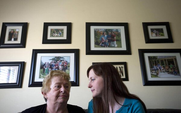 Stacey Cattran (right) age 40 with her mother Jackie Coulbeck (left) age 73. Stacy's father Bill Coulbeck age 72 passed away in May 2008 from mesothelioma, a cancer solely associated to exposure from asbestos. Bill was exposed to asbestos in a number of workplaces in the 1960's and 70's. Photo taken May 24, 2014 in Guelph, Ontario at Stacy's home.Louie Palu/The Globe and Mail