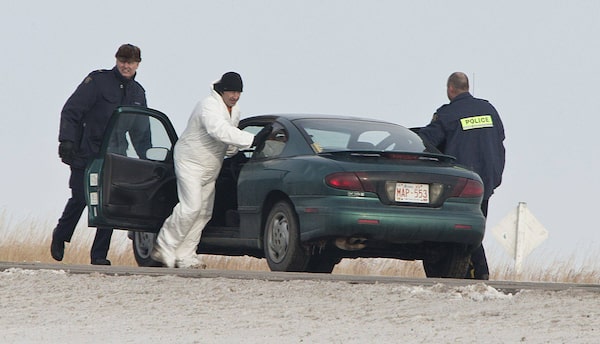 RCMP examine a car at the side of Highway #2, 130 kms south of Calgary after two bodies were discovered and two others were taken to hospital in critical condition early this moring.CHRIS BOLIN / FOR THE GLOBE AND MAIL