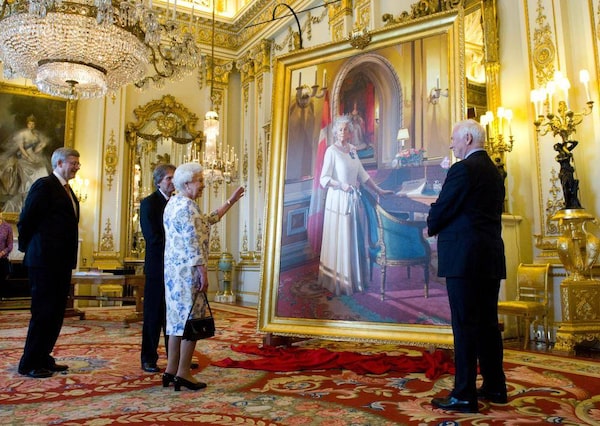 Prime Minister Stephen Harper, left, stands with Queen Elizabeth as she unveils a portrait of herself in the White Drawing Room at Buckingham Palace in London on Wednesday, June 6, 2012.Sean Kilpatrick