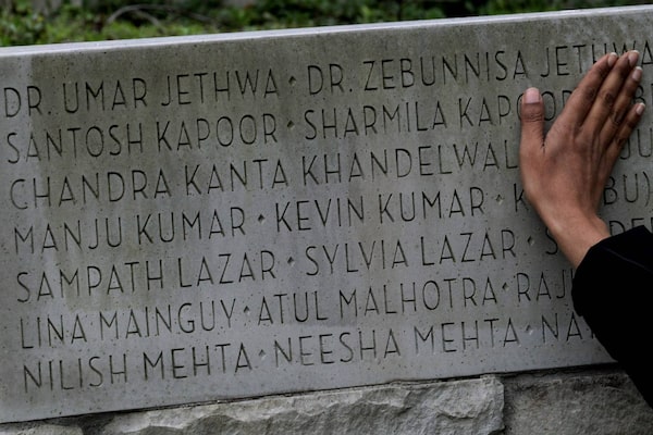 Renee Saklikar runs her hand across the names of victims on a memorial honouring those killed in the bombing of <strong>Air</strong> <strong>India</strong> Flight <strong>182</strong>, at Stanley Park in Vancouver, B.C., on Thursday June 17, 2010. Her aunt and uncle, doctors Zebunnisa Jethwa and Umar Jethwa were killed in the bombing.Darryl Dyck/The Canadian Press