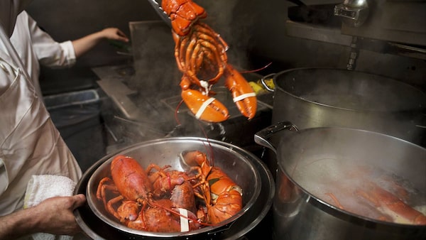 Cooked lobsters are removed from pots of boiling water at a Toronto restaurant in this 2014 file photo.Matthew Sherwood/The Globe and Mail