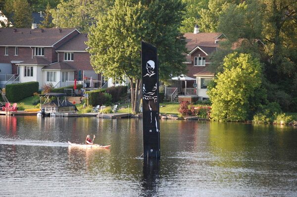 Mr. Nyquist and his staff wanted whatever it was to be built from the plastic materials that were revolutionizing the area dock industry. He commissioned local artist Beverley Hawksley – mother of well-known musician Hawksley Workman but increasingly an artist of national reputation herself – to come up with something that could be etched into the material, and she did a lovely silhouette of Thomson in a familiar pose. They then anchored it vertically in the middle of the river, where it spun and bobbed for months. (Not surprisingly, the phallic jokes were endless.)
