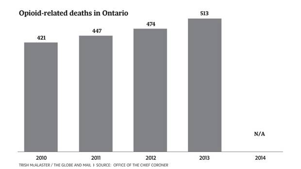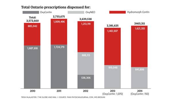 Together, the drugs are contributing to a spike in opioid prescribing. In 2012, the year OxyContin was delisted from provincial drug plans, 18.3 million opioid prescriptions were dispensed in Canada. Last year, that figure jumped 18.6 per cent to 21.7 million, according to IMS.