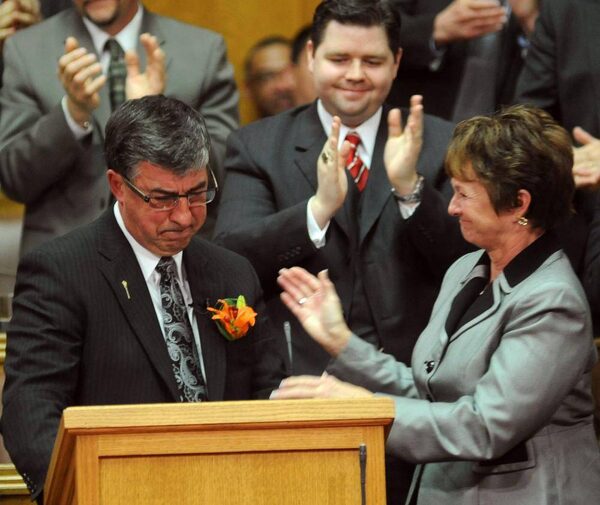 Deputy Premier and Finance Minister Ken Krawetz is comforted by MLA June Draude (right)ROY ANTAL/The Canadian Press