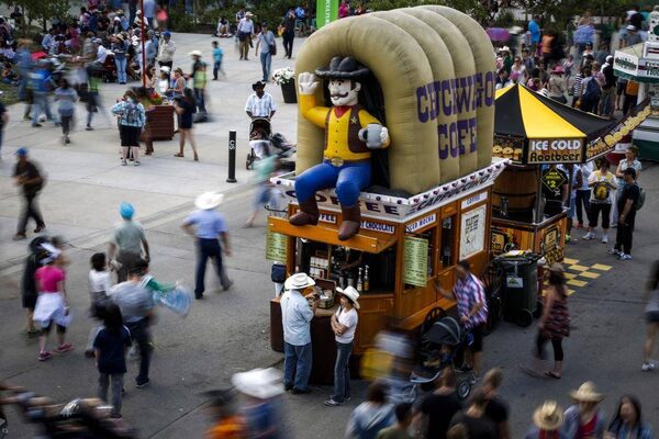 An inflatable cowboy looks out over visitors at the Calgary Stampede on Sunday, July 6, 2014.Jeff McIntosh/The Canadian Press