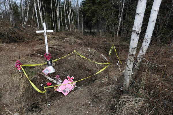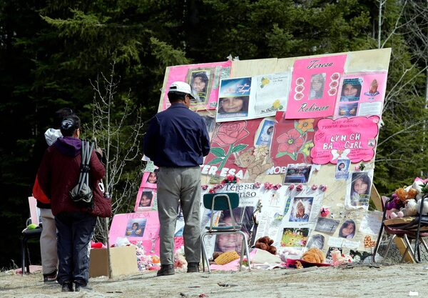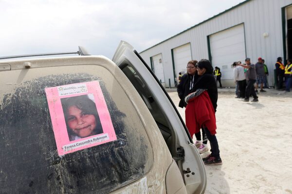 Volunteers from neighbouring communities stop to look at a memorial before starting to search for the remains of Teresa Robinson on the Garden Hill First Nation in Manitoba.Lyle Stafford/The Globe and Mail