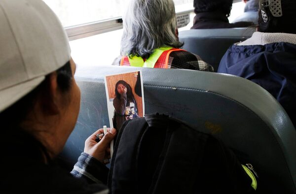 A volunteer looks at a photo of Teresa Robinson on a school bus while being transported to a search site.Lyle Stafford/The Globe and Mail