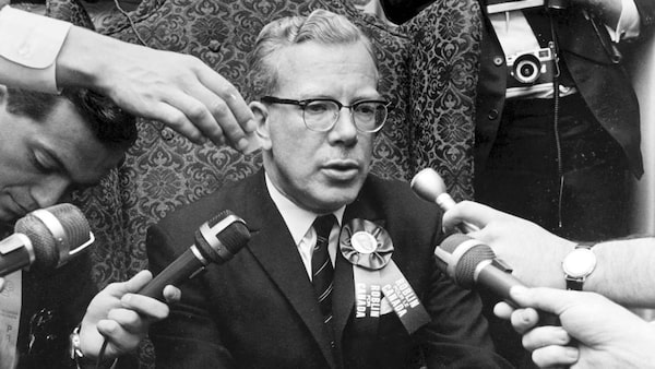 Manitoba premier Duff Roblin is surrounded by microphones at the PC leadership convention in Toronto on Sept. 5, 1967. Roblin, the dapper former Manitoba premier who came within a whisker of leading the national Progressive Conservative party, has died.Chuck Mitchell
