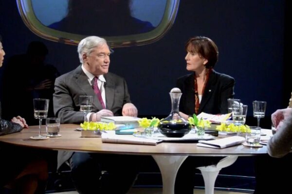 Shot before a live studio audience with some prerecorded segments, the show features Lord Black and co-host Denise Donlon at a round table laden with newspapers, books, and a decanter of wine, discussing current affairs with three other guests.