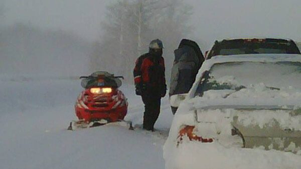 An unidentified snowmobiler check on stranded motorists on highway 402 near Sarnia, Ont. on Tuesday Dec. 14, 2010, as seen from the vehicule of Colin Stewart, of Tottenham, Ont.Colin Stewart