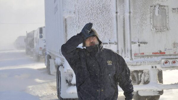 A police officer climbs on the cab of a semi to check on its driver on Tuesday Dec. 14, 2010 on London Line, East of Sarnia, Ont. A state of emergency has been declared for Lambton County as snow stranded hundreds of motoristsGlenn Ogilvie