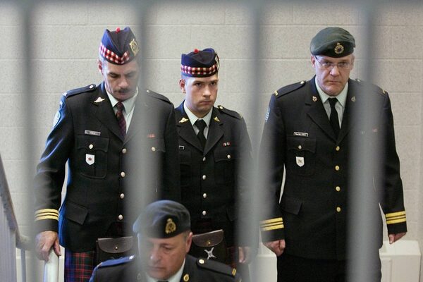 Cpl. Matthew Wilcox, the 24-year-old soldier from Glace Bay, N.S., who was convicted in July of criminal negligence causing death and neglect of duty, is framed by a railing as he is escorted from his sentencing hearing in Sydney, N.S. on Friday, Sept. 11, 2009.ANDREW VAUGHAN