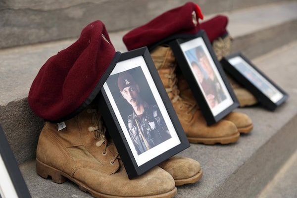 A photo and boots of Master Corporal Clayton Matchee and others are placed on the front steps of Parliament during an anti-malarial drug mefloquine rally on Sept. 19, 2017.Dave Chan/The Globe and Mail