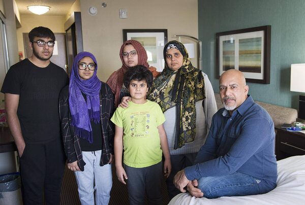 Tauseef Bhatti and his wife, Weena Sehar, second right, with children Bia, Aadn, Tuba and Minah in a hotel room in Montreal on Dec. 21, 2017.Graham Hughes/The Globe and Mail
