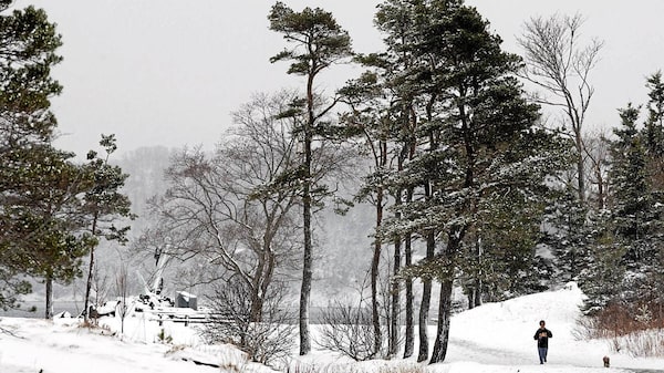 A runners heads through Point Pleasant Park in Halifax on Sunday April 8, 2012. The region was hit with a spring storm that delivered rain, sleet and up to 20 centimetres of snow.Andrew Vaughan/The Canadian Press
