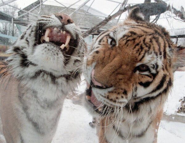 Two Siberian Tigers at Winnipeg's Assiniboine Park Zoo press their noses against the glass in their enclosure, Wednesday, Dec.18, 2002. Officials with the Assiniboine Park Zoo said an older Siberian male tiger pushed open a mistakenly unlocked gate and stepped into a neighbouring den housing two younger male cats.Brian Donogh/The Canadian Press