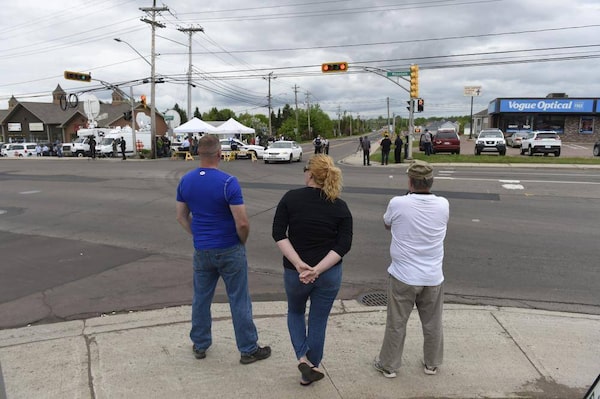 Bystanders gather to watch RCMP officers and the media crowds gathered by a roadblock on Hildegard Road near Mountain Road in Moncton on Thursday, June 5 2014. Police warned residents to stay indoors and not open their doors for anyone they didn't know.Fred Lum/The Globe and Mail