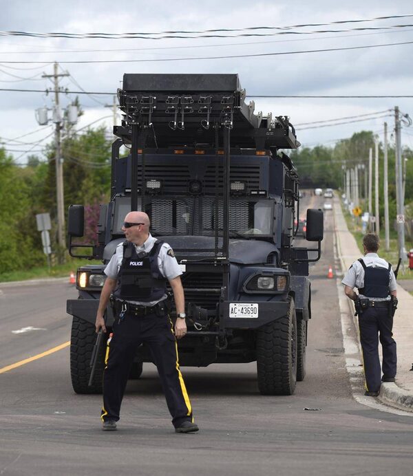 A large armoured personal carrier drives up Hildegard Road toward a police roadblock in Moncton on Thursday, June 5, 2014, as the manhunt for Justin Bourque continues.Fred Lum/The Globe and Mail