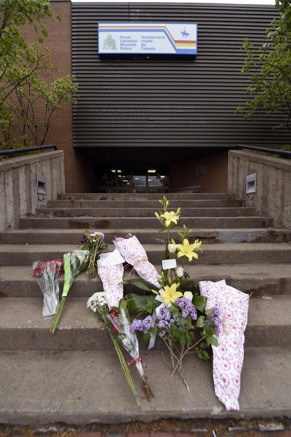 Flowers lay on the front steps of the RCMP detachment at 520 Main St. in Moncton on Thursday, June 5, 2014, in memory of the three police officers killed the day before.Fred Lum/The Globe and Mail