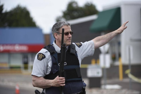 RCMP officers man a roadblock on Hildegard Road, near Mountain Road, in Moncton on Thursday, June 5 2014. Police are searching for the shooter after three of their own were killed on Wednesday.Fred Lum/The Globe and Mail