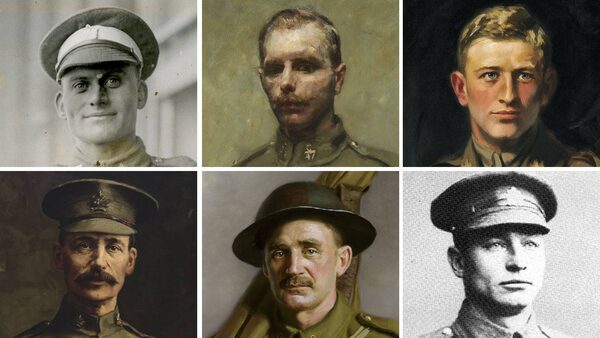 Six Canadian soldiers received the Victoria Cross for their service at the Battle of Hill 70. Clockwise from top left: Sergeant-Major Robert H. Hanna; Acting Corporal Filip Konowal; Major Okill Massey Learmonth; Private Harry W. Brown; Private Michael O’Rourke; and Sergeant Frederick Hobson.