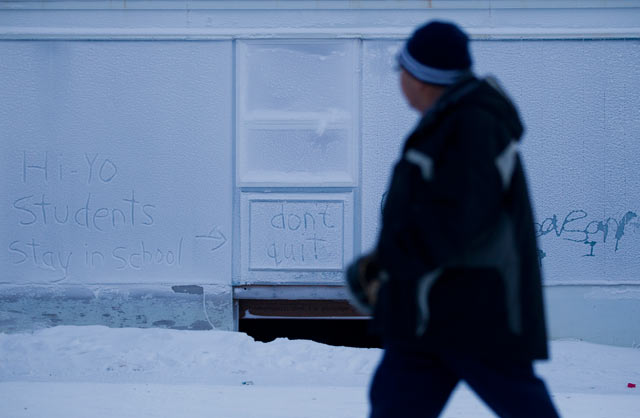 Photo: A message written in the frost on a wall in Cambridge Bay in northern Nunavut, urging students to stay in school.