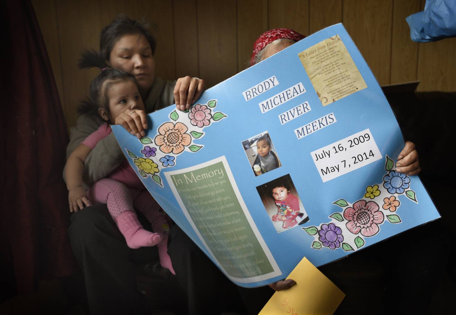May 5: Wawakeno Meekis, holds her one year old daughter Makenna, and her mother-in-law Adelaide Meekis look over posters and signs for her son Brody Michael River in their Sandy Lake First Nation in northern Ontario.