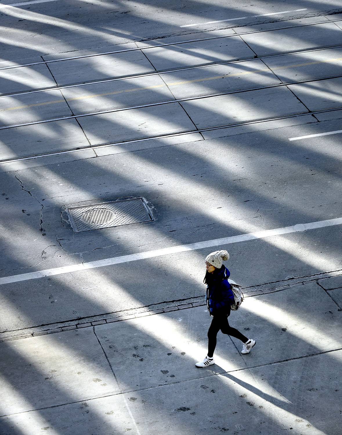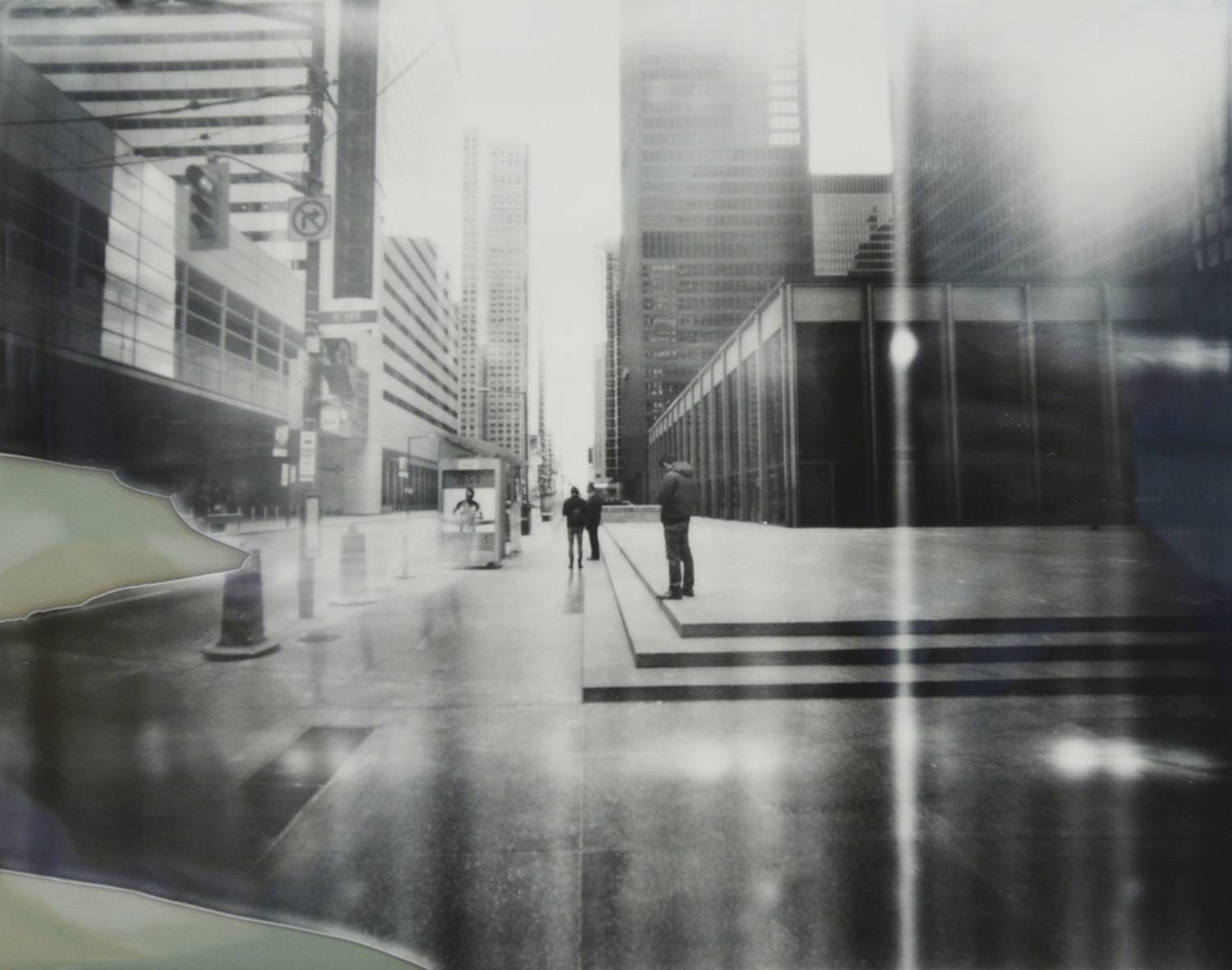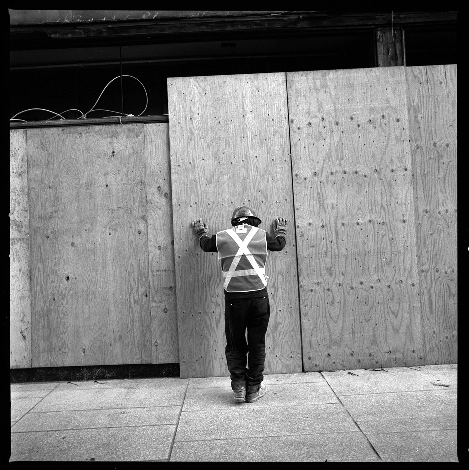 January 20: A construction worker holds up wooden hoarding on Bloor Street in Toronto. Photographed with a Hasselblad film camera and Kodak Tri X film.