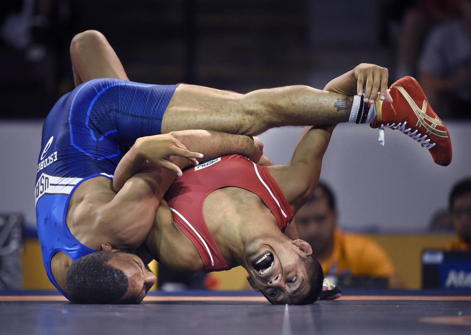 July 17: Peruvian wrestler Pablo Benites, in red, reacts during men's freestyle 57 kg match at the Toronto 2015 Pan Am Games.