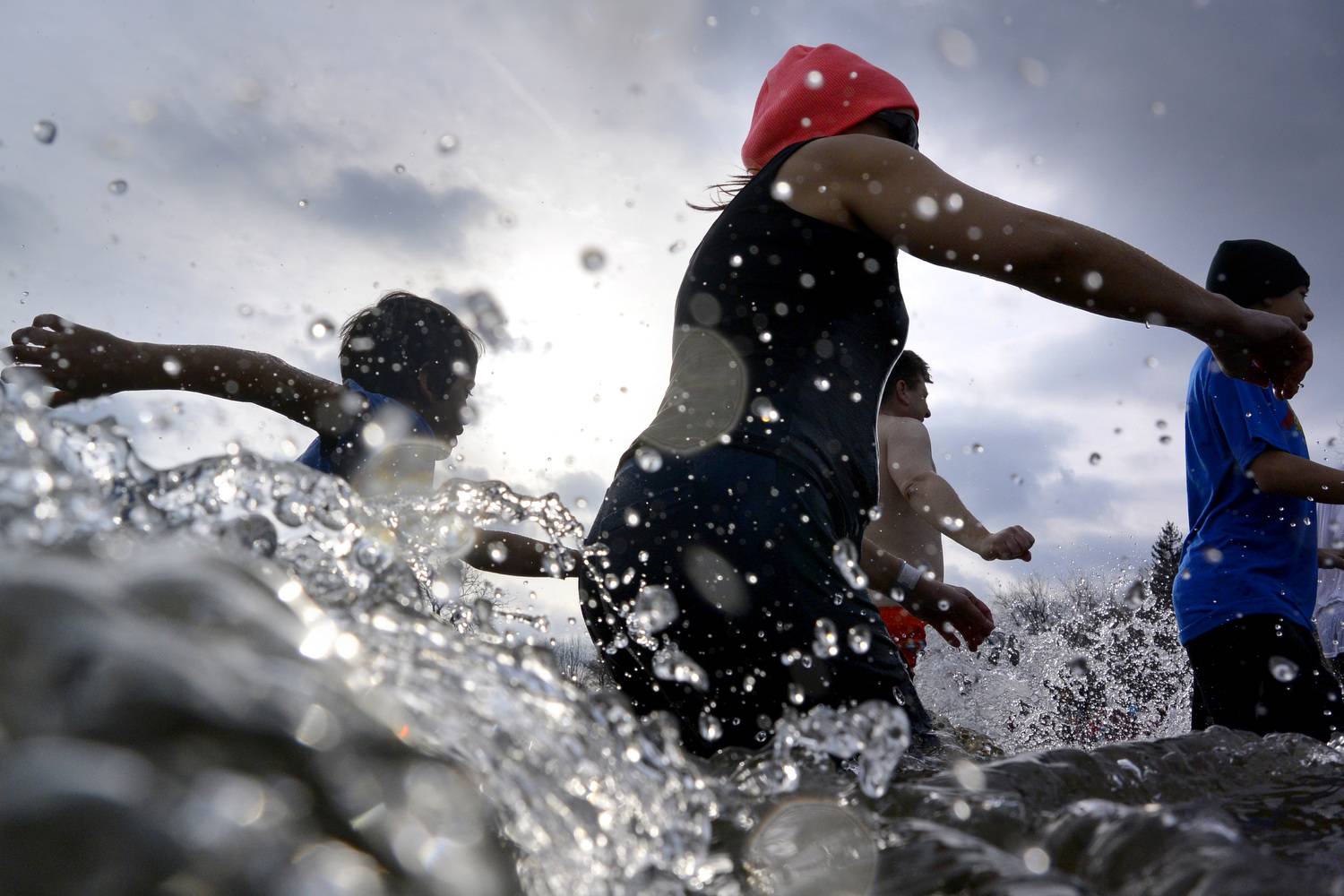 January 1: Despite the freezing temperatures, 700 dippers take part in the 30th Courage Polar Bear Dip at Coronation Park in Oakville, Ontario.