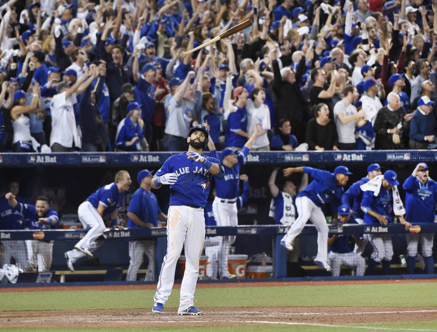 October 14: Toronto Blue Jay Jose Bautista throws his bat in the air after hitting a three-run homer against the Texas Rangers in game five of the American League Division Series in Toronto.