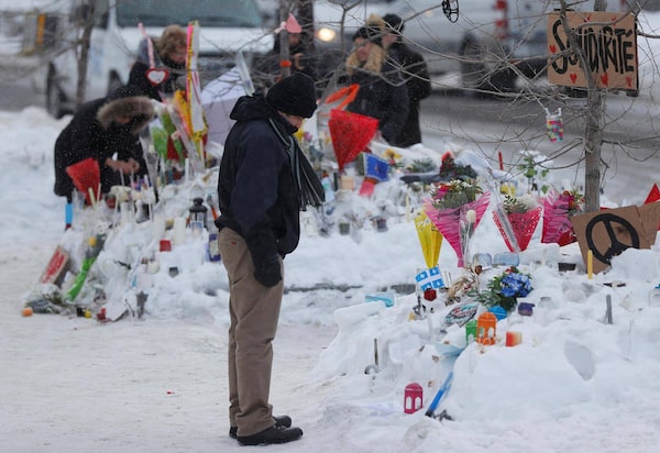 A man looks at the memorial near the site of a fatal shooting at the Quebec Islamic Cultural Centre in Quebec City, Canada January 31, 2017.MATHIEU BELANGER/Reuters